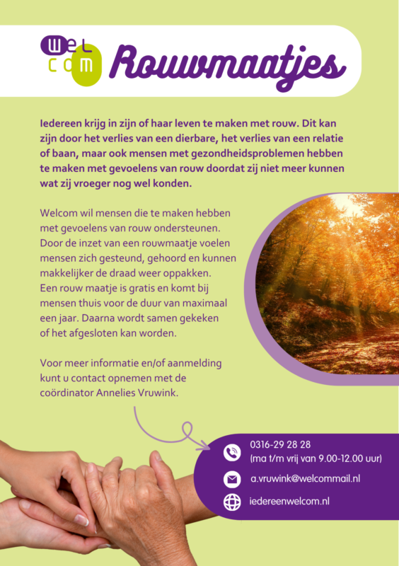 Welcom wil mensen die te maken hebben met gevoelens van rouw ondersteunen. Door de inzet van een rouwmaatje voelen mensen zich gesteund, gehoord en kunnen makkelijker de draad weer oppakken.